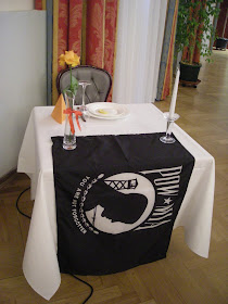 The small table set for one that is off on its own is reserved to honour our fallen comrades in arms. This symbolizes that they are with us, here in spirit. We should never forget the brave men and women who answered our nation's call [to serve] and served the cause of freedom in a special way. We are ever mindful that the sweetness of enduring peace has always been tainted by the bitterness of personal sacrifice. We are compelled to never forget that while we enjoy our daily pleasures, there are others who have endured the agonies of pain, deprivation and death.
