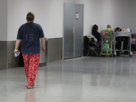 In all fairness, this is an international airport. This pj panted woman could be from anywhere in the world. But I'd bet our orders home (ok, maybe not that...maybe something like...breakfast) that she's from... and going to ...America.